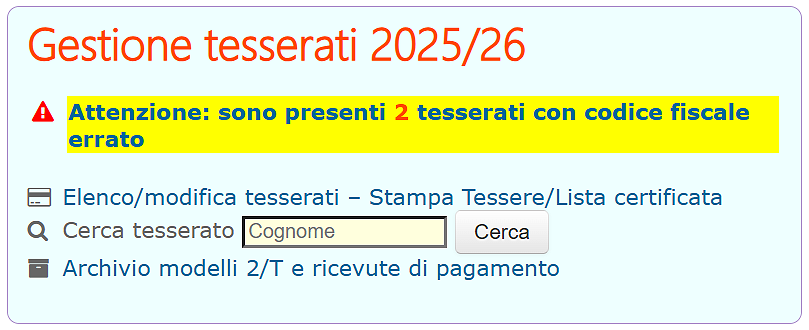 Se tra i tesserati della società sportiva ci sono persone con il Codice Fiscale errato, nel Tesseramento Online, nella sezione "Gestione Tesserati" comparirà questa notifica: